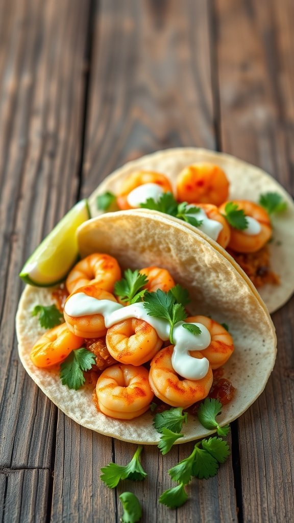 - Assemble the tacos by placing the shrimp on the tortillas, drizzling with avocado crema, and garnishing with fresh cilantro.