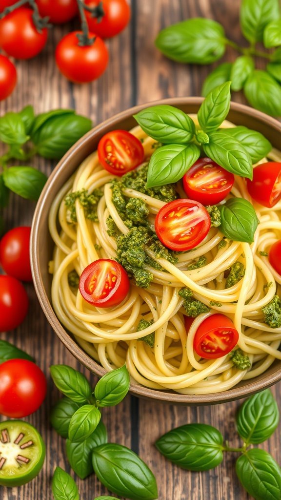 - Once the noodles are tender, remove them from the air fryer and toss with basil pesto and cherry tomatoes.