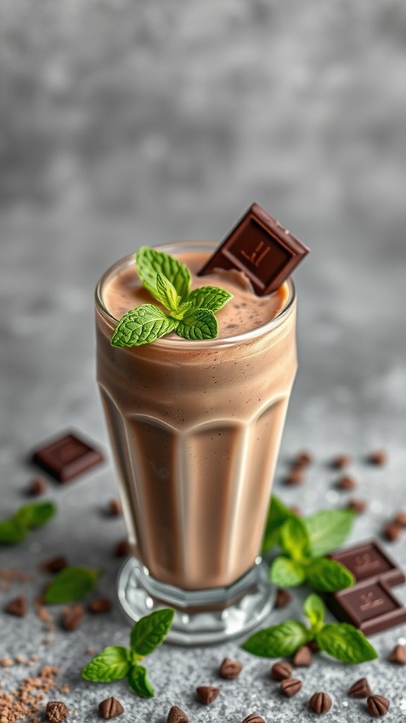 - Blend Ingredients: In a blender, combine the chocolate protein powder, banana, almond milk, cocoa powder, and peppermint extract. Add a handful of ice cubes.