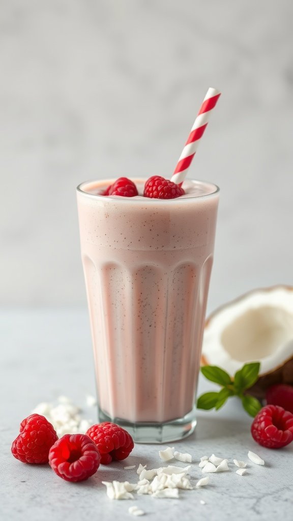 - Serve: Pour the shake into a tall glass and garnish with a few fresh raspberries and a sprinkle of shredded coconut on top.