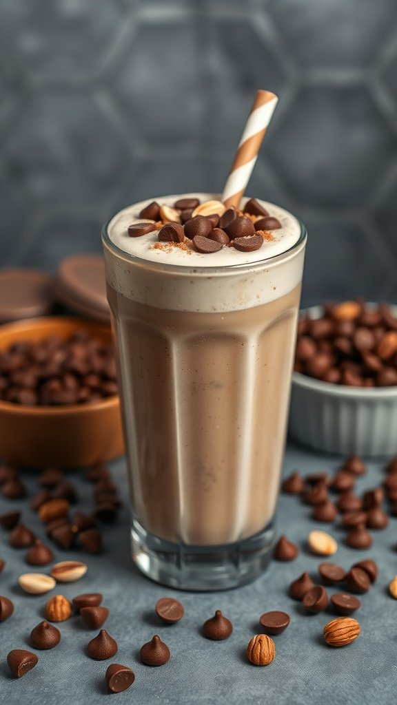 - Serve: Pour the shake into a glass and top with extra chocolate chips and nuts if desired. Enjoy!