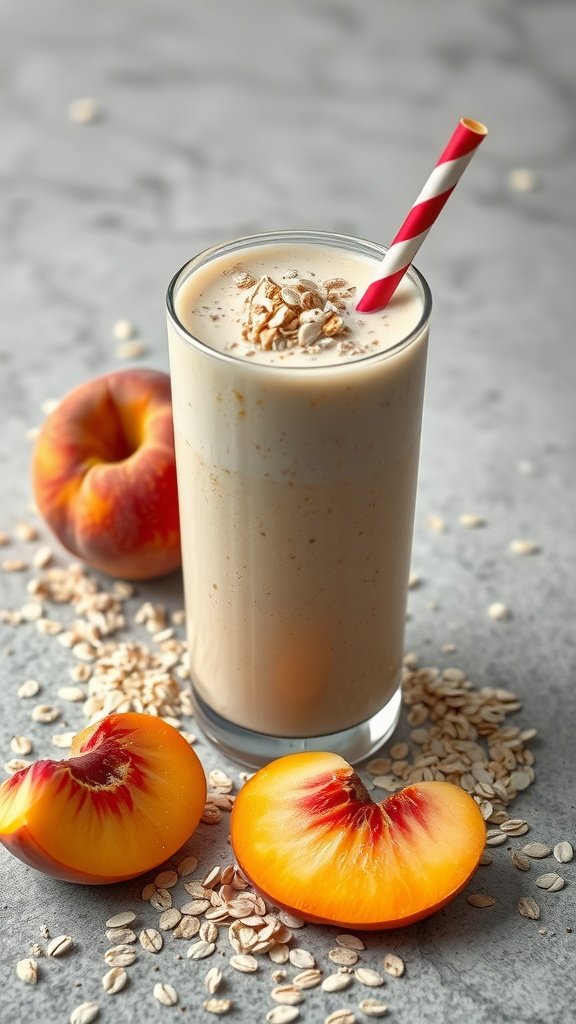 - Blend Ingredients: In a blender, combine the peach slices, rolled oats, almond milk, protein powder, honey or syrup, and cinnamon.