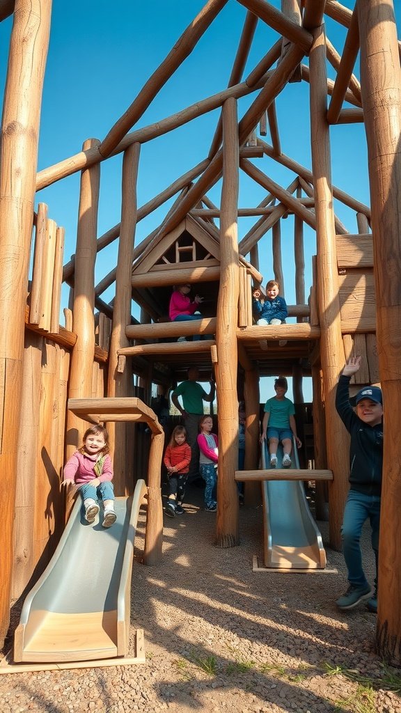 Natural wood play structures are a fantastic addition to any DIY playground backyard. They provide a warm, inviting look while blending seamlessly with nature. The image showcases a sturdy wooden play structure, complete with a climbing area and swings, perfect for kids to explore and enjoy.