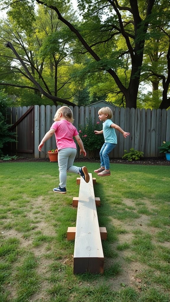Building a balance beam is a fantastic DIY project for your backyard playground. It’s simple to make and brings endless fun for kids. In the image, you can see two children enjoying their time on a wooden balance beam, which showcases the joy and excitement this feature can bring.