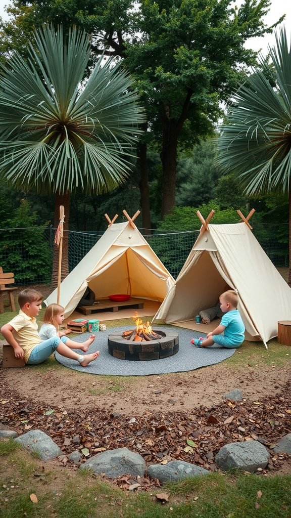 A campsite play area can be a perfect spot for kids to enjoy the outdoors. Picture two cozy tents pitched in a natural setting, surrounded by tall trees and playful palm-like plants. Inside, kids can gather around a safe, contained fire pit, sharing stories and roasting marshmallows. It’s like bringing the joy of camping right to your backyard!