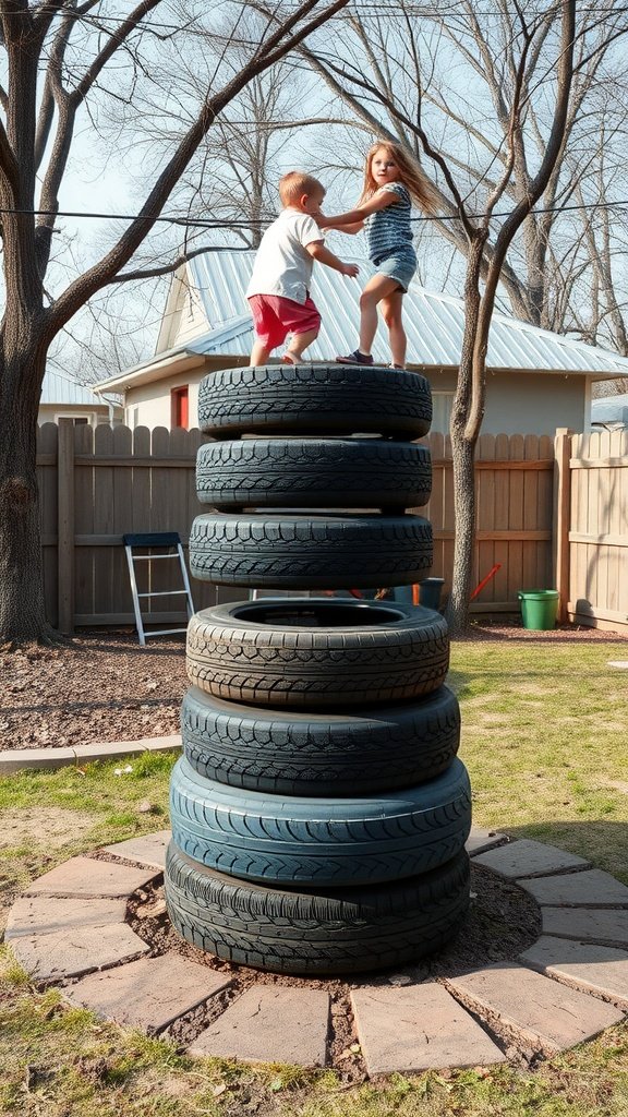 To make this climbing tower, you’ll need a stack of old tires. These tires provide a sturdy base and can be found at auto shops or online marketplaces. The kids in the image are enjoying their time climbing on the tires, showing how much fun this structure can provide.