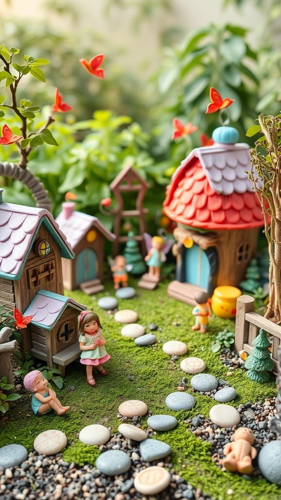 To create your own fairy garden playground, gather some fun materials. You’ll need miniature fairy houses, decorative stones, assorted plants, and playful figurines. A mix of moss and gravel will help establish a vibrant ground cover, while whimsical accessories bring the garden to life.