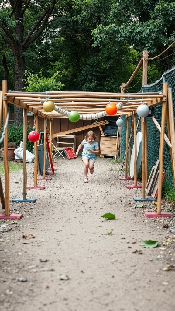 Creating a DIY playground in your backyard can spark joy and creativity. A garden obstacle course is a fantastic way to keep kids active while having fun. In the image, we see a child navigating through a simple yet engaging obstacle course made from wooden beams and colorful balls. It’s not just playful; it’s also a great challenge for kids’ agility and coordination.