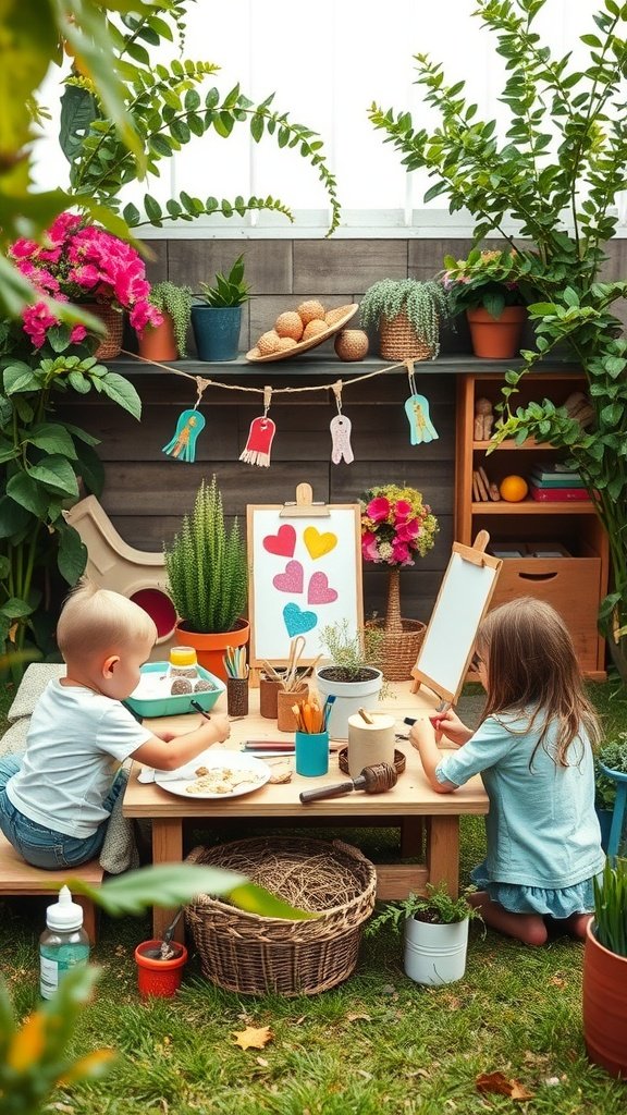 Creating a DIY playground in your backyard can be a great way to blend playtime with creativity. In this corner, we see kids engaged in crafting activities surrounded by nature. This setup encourages imagination while enjoying the outdoors.