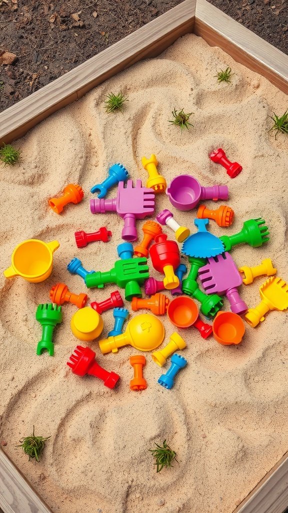 A sandbox is a classic element in any DIY playground backyard. It offers endless fun for kids while sparking their creativity. The image shows a vibrant mix of colorful sand toys scattered across a sandy base, surrounded by a wooden frame. This simple setup creates a delightful space for children to dig, build, and play.