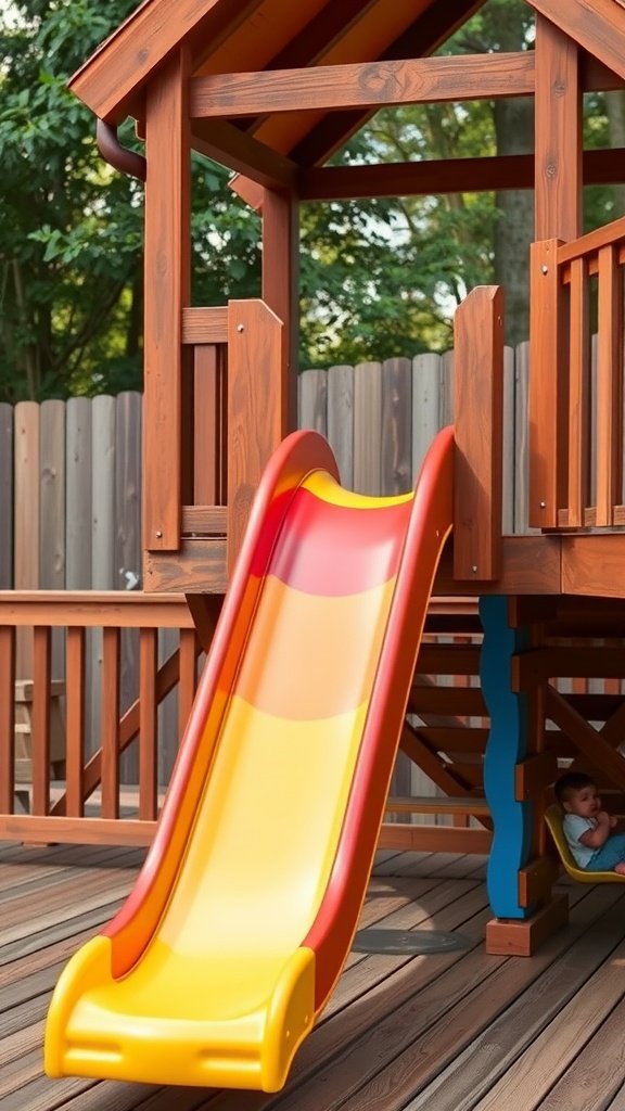 A slide from the deck is a fantastic addition to any DIY playground backyard. It adds a fun element that kids will absolutely love. Imagine your little ones laughing and sliding down, enjoying every moment of playtime.