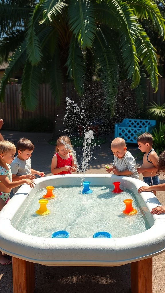 Water play stations bring joy and excitement to any DIY kids playground. Imagine a space where children can splash, pour, and experiment with water in a safe and fun way. The image showcases a vibrant water table where kids are fully engaged, illustrating the fun that can unfold.