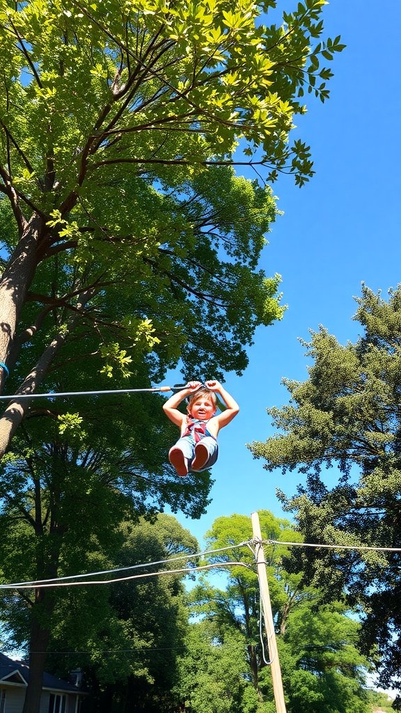 To set up a zip line, you’ll want to use sturdy materials and ensure safety throughout the process. The image shows a child enjoying a zip line, hanging in the air with a big smile. This fun element transforms a simple backyard into a memorable play space.
