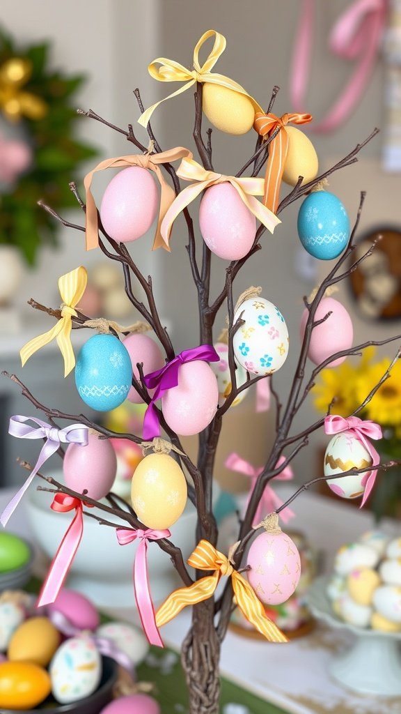 - Hang the Eggs on the Tree – Space them evenly among the branches, mixing colors and sizes for a balanced look.
