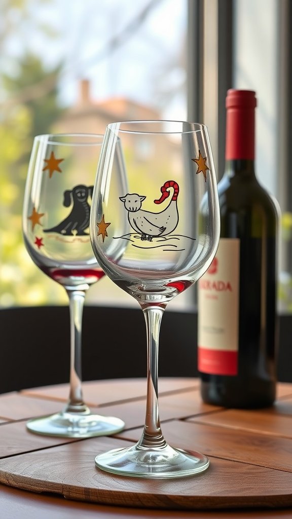 The image shows two beautifully decorated wine glasses. One features a playful dog, while the other has a whimsical duck, surrounded by colorful stars. These fun designs add a personal touch, making the glasses perfect for sipping wine or simply as decorative pieces.