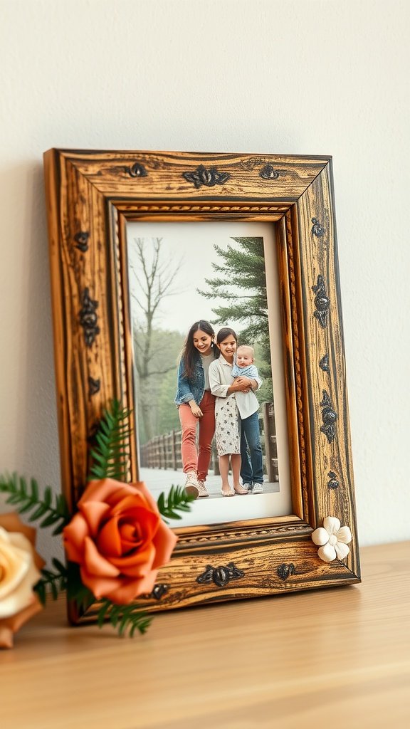 The image shows a beautifully framed picture that captures a special moment. The frame is adorned with decorative elements like flowers, making it not just functional but also a lovely piece of home decor. With a few materials from the Dollar Tree, you can create something similar!