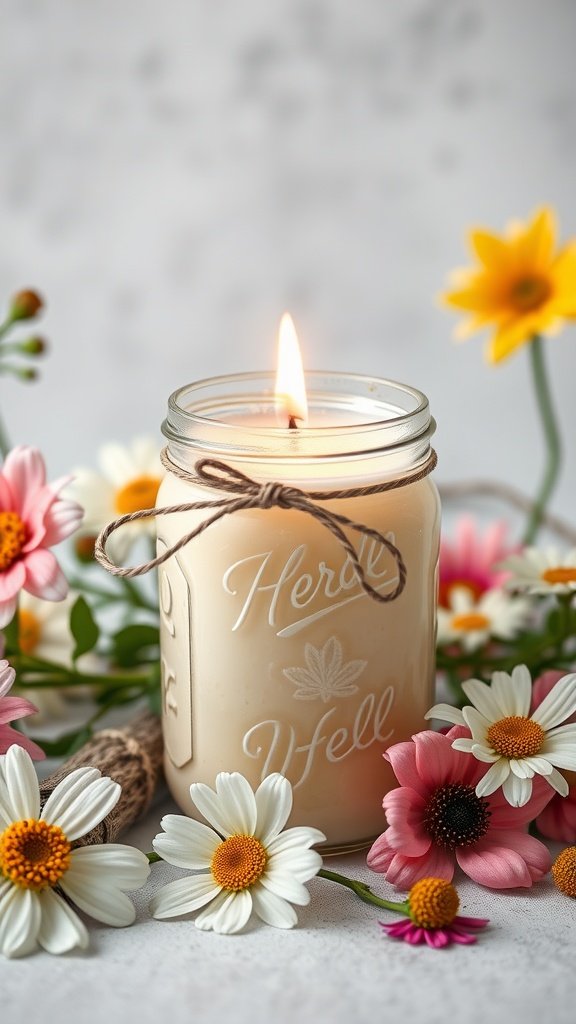 The image shows a beautifully crafted candle in a mason jar, adorned with a simple twine bow and surrounded by vibrant flowers. This visual highlights how easy and attractive this gift can be, making it a great idea for all ages.