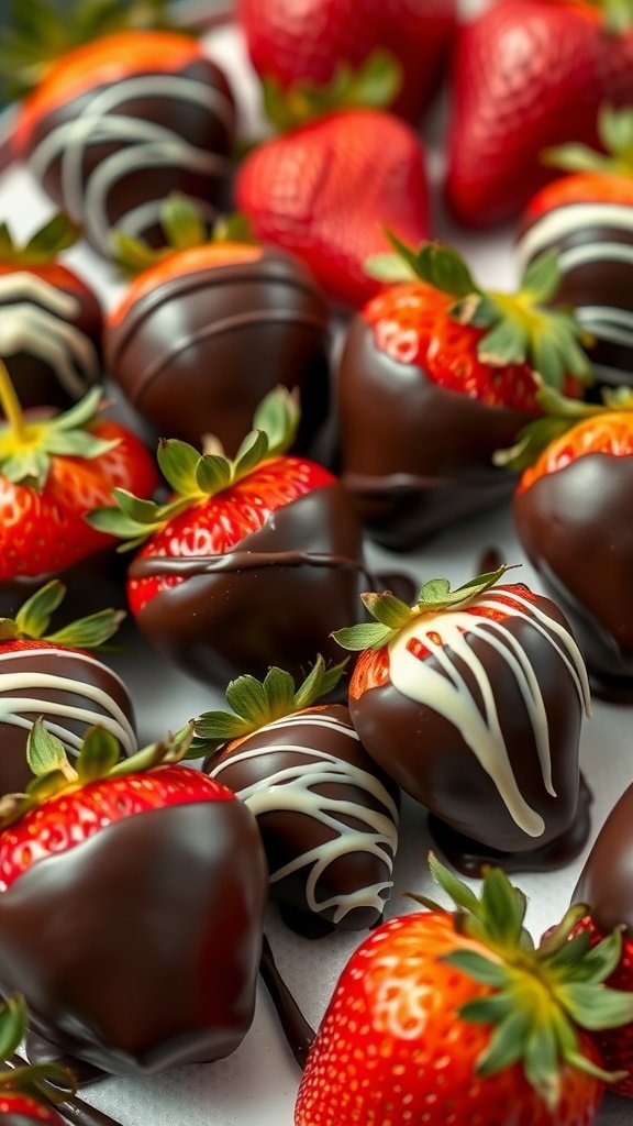 - Set on a Baking Sheet: Place the dipped strawberries on a parchment-lined baking sheet. If desired, melt white chocolate chips and drizzle over the chocolate-covered strawberries for added flair.