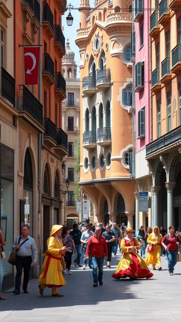 Barcelona is a city bursting with color and life, and its artistic vibes can be felt in every corner. In this lively scene, vibrant buildings line the streets, showcasing a mix of architectural styles that tell stories of the past. The warm hues of the buildings create a welcoming atmosphere, encouraging you to explore.