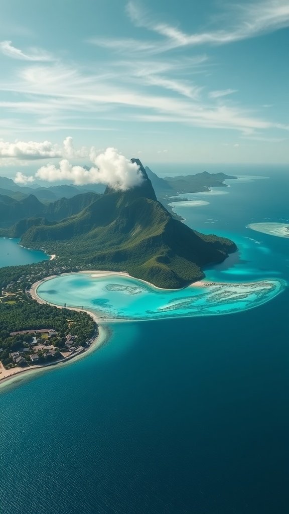 Bora Bora is a gem in the South Pacific, known for its serene beauty and turquoise waters. The image showcases the lush green mountains and vibrant lagoons that make this destination so appealing. The blend of natural landscapes and luxurious resorts creates a unique atmosphere where relaxation is key. Here, you can unwind on soft sandy beaches or enjoy water activities like snorkeling and diving. The panoramic views from above reveal the stunning coral reefs and the famous Mount Otemanu, making it a paradise for photographers and nature lovers alike.