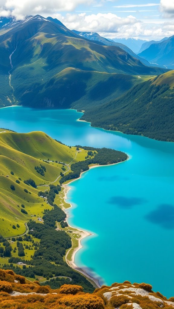 New Zealand is home to some of the most beautiful places to travel, and its lush landscapes are a big part of that charm. The image captures the vibrant greens and stunning blues of nature, showcasing rolling hills that meet crystal-clear waters. The contrast between the land and sea creates a picture-perfect scene that invites exploration.