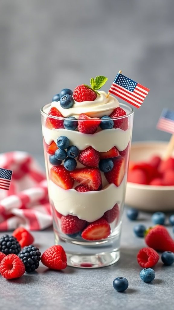 Start with a glass filled with layers of strawberries, blueberries, and a light, fluffy whipped cream or yogurt. The small American flags add a fun touch, making this dessert a star at your holiday gathering.