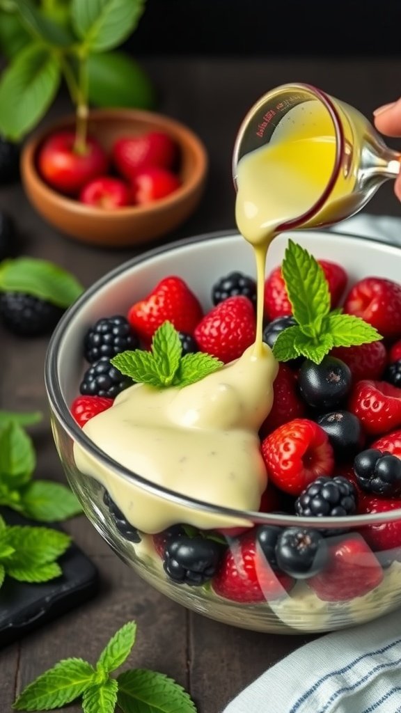 In the image, you see a beautiful bowl filled with strawberries, blueberries, and blackberries, all topped with a creamy mint dressing. The mint leaves add a touch of green, making it visually appealing. Drizzling that dressing over the berries creates a delightful contrast, inviting everyone to dig in.