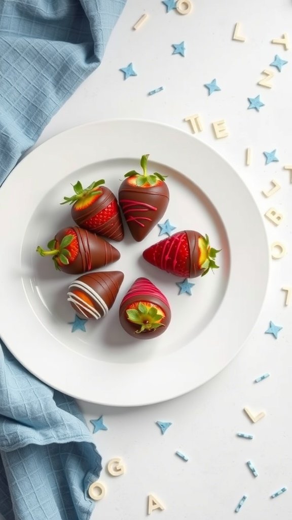 To make them, you’ll need some fresh strawberries and low-carb chocolate. The image shows beautifully dipped strawberries, featuring a mix of white and colored chocolate drizzles. Their vibrant colors and shiny coating make them not only tasty but also a feast for the eyes.