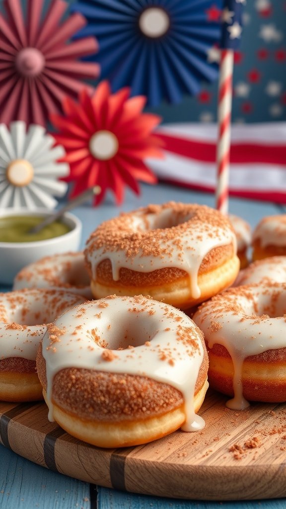 The image shows a tempting stack of donuts sitting on a wooden board. The white icing drips down the sides, and the sprinkle of cinnamon on top adds to their charm. In the background, you can see colorful decorations that are perfect for Independence Day, giving a fun and festive vibe.