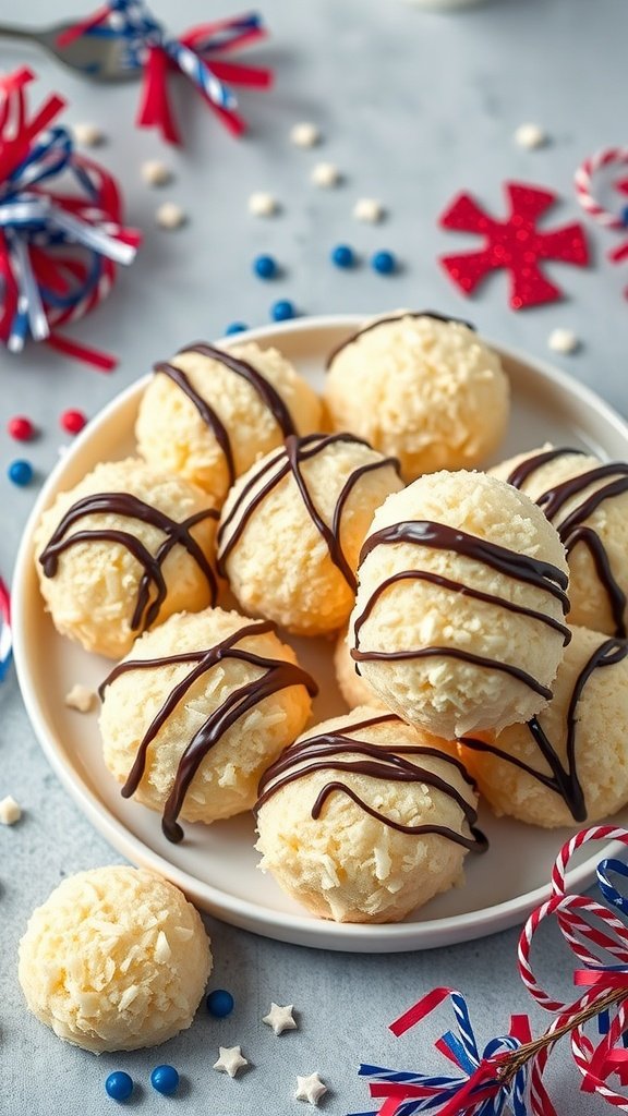 Coconut macaroons are a fantastic choice for Fourth of July low carb desserts. These sweet treats are not just easy to make; they’re also packed with flavor. The image captures a delightful platter of coconut macaroons, each drizzled with rich dark chocolate. The macaroons have a golden, fluffy texture, while the chocolate adds a perfect touch of indulgence. Around the plate, festive decorations in red, white, and blue enhance the holiday spirit, making them a great addition to your celebration.