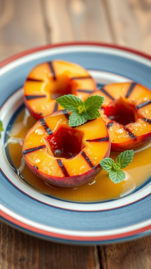 Grilled peaches make a delightful addition to your Fourth of July low carb desserts. Their natural sweetness intensifies when grilled, giving a unique flavor that everyone will enjoy. The image captures perfectly charred peaches, beautifully arranged on a plate, drizzled with a sugar-free syrup. Fresh mint leaves add a pop of color and a hint of freshness.
