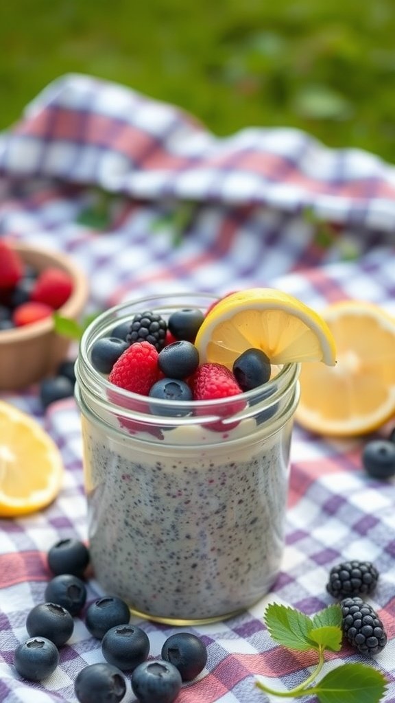 Lemon Blueberry Chia Pudding is a delightful treat that fits perfectly into the theme of Fourth of July low carb desserts. The image showcases a charming jar of chia pudding, topped with fresh blueberries, raspberries, and a slice of lemon. The vibrant colors of the berries against the creamy pudding create an inviting and festive look, ideal for summer celebrations.