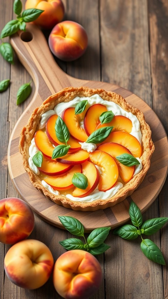 The tart features a crispy almond flour crust, making it a great alternative to traditional sugary desserts. Topping it with fresh peaches adds a vibrant touch, and the basil leaves give it a fresh twist. It’s eye-catching and a delight to eat!