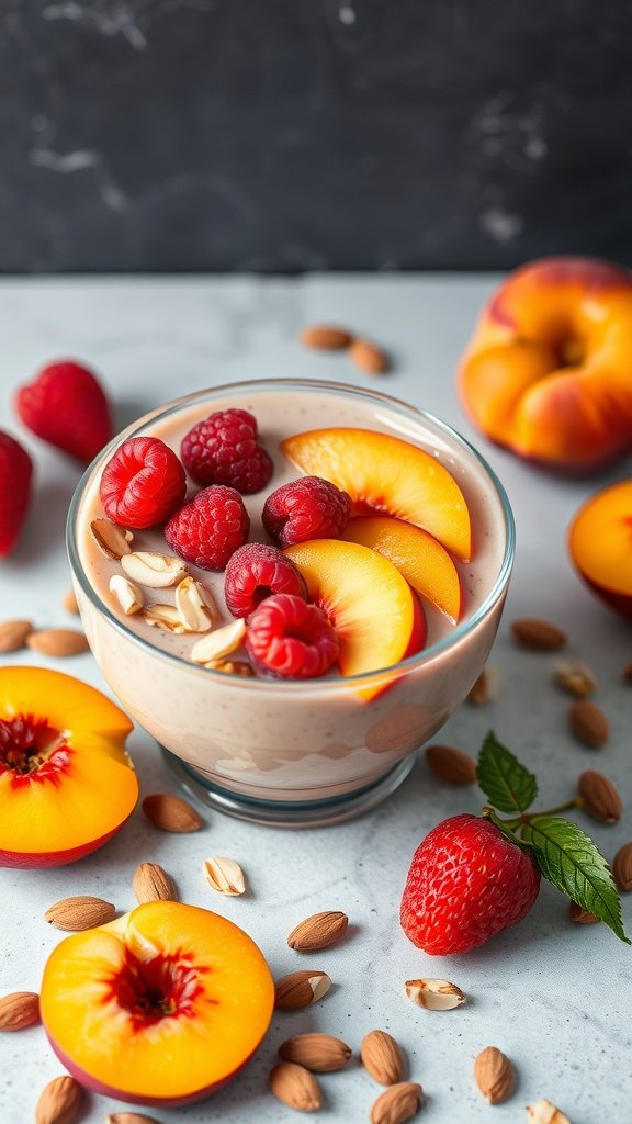 - Pour the smoothie into a bowl and top with sliced peaches, raspberries, and almonds.