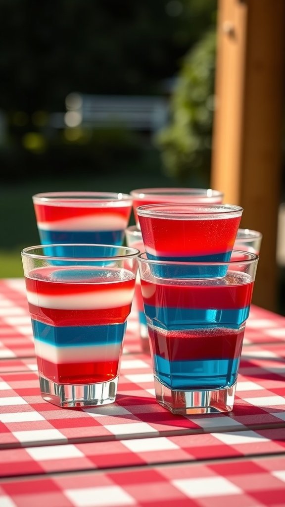 The image showcases colorful jello cups arranged neatly, each filled with bright red, white, and blue layers. These cups are sure to be a hit at your party, providing a light, refreshing treat without the added sugars.