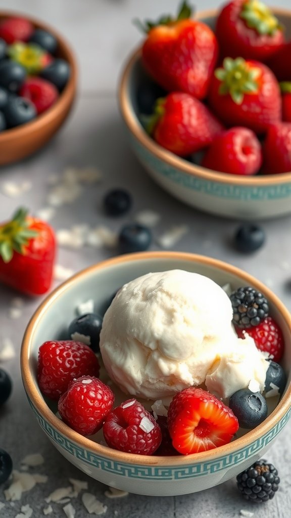 This Vanilla Bean Coconut Ice Cream is a perfect treat for your Fourth of July celebration. It’s creamy, rich, and low in carbs, making it a delightful choice for those watching their sugar intake. The image showcases a generous scoop of this ice cream sitting atop a colorful mix of fresh strawberries, raspberries, and blueberries, all ready for your summer festivities.