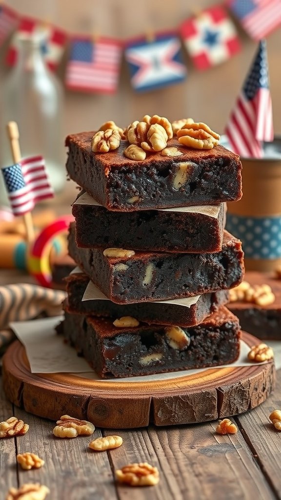 These zucchini brownies are a perfect addition to your Fourth of July low carb desserts. They look rich and delicious, featuring a stack topped with walnuts, giving them a lovely crunch. The festive backdrop with tiny American flags and stars adds a celebratory touch, making them ideal for your holiday table.