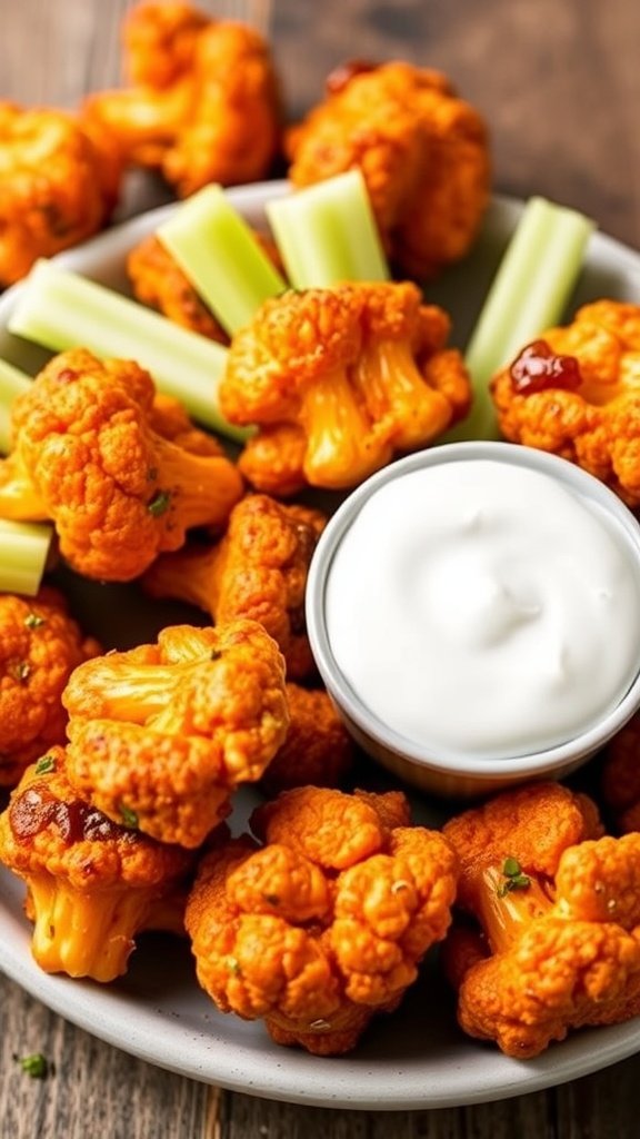 The image shows vibrant orange buffalo cauliflower bites surrounded by crunchy celery sticks. A small bowl of creamy dip sits in the middle, making it easy to enjoy these bites. The bright colors and fresh ingredients make this dish appealing and festive.