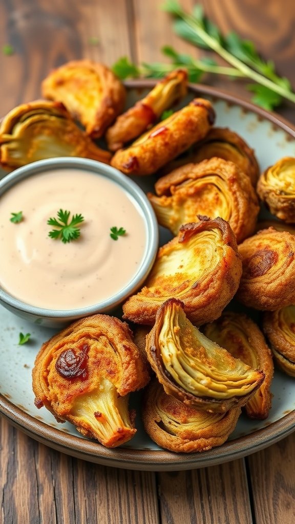 These fried artichoke hearts look golden and appetizing, arranged neatly on a plate. The rich dipping sauce adds a touch of creaminess to the dish, inviting everyone to dig in. They’re not only delicious but also a great way to impress your guests with a unique appetizer.