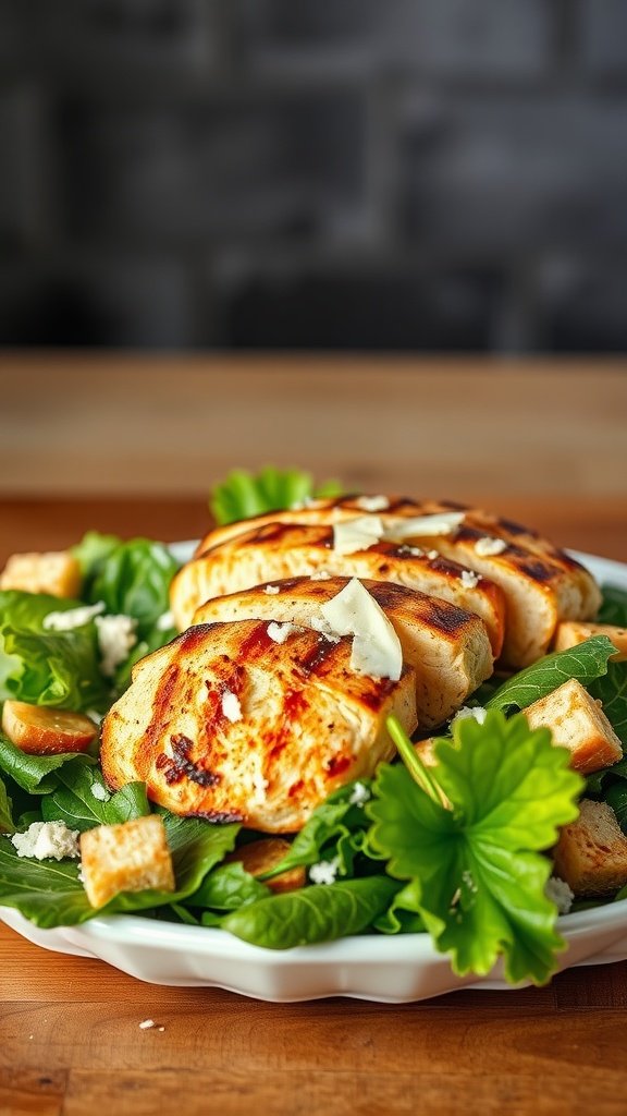 The dish features succulent grilled chicken slices resting on a bed of fresh greens. Crisp romaine and baby spinach are mixed with crunchy croutons, which you can easily swap for low-carb alternatives. A sprinkle of parmesan cheese adds a delightful touch.