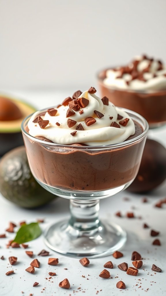 The image showcases a couple of elegant servings of the mousse topped with whipped cream and chocolate shavings, surrounded by fresh avocados and chocolate pieces. It looks indulgent yet is surprisingly simple to make, ensuring you can impress your guests without spending hours in the kitchen.