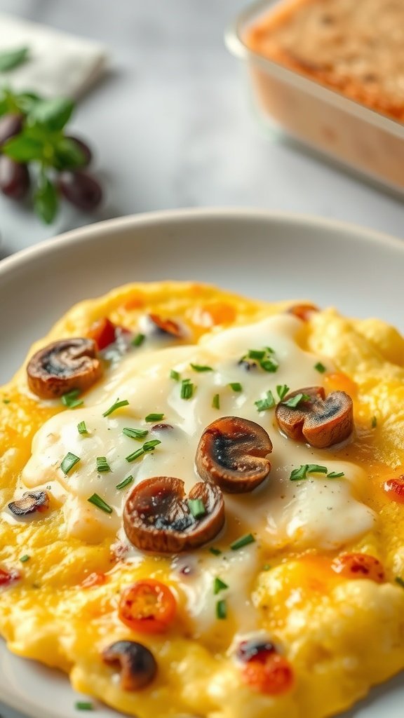 The omelette features golden, fluffy eggs, sautéed mushrooms, and gooey cheese that melts beautifully on top. The fresh chives add a touch of brightness, making it not only tasty but visually appealing too!