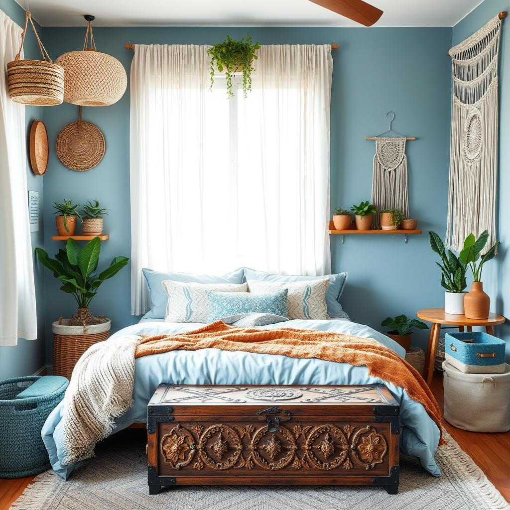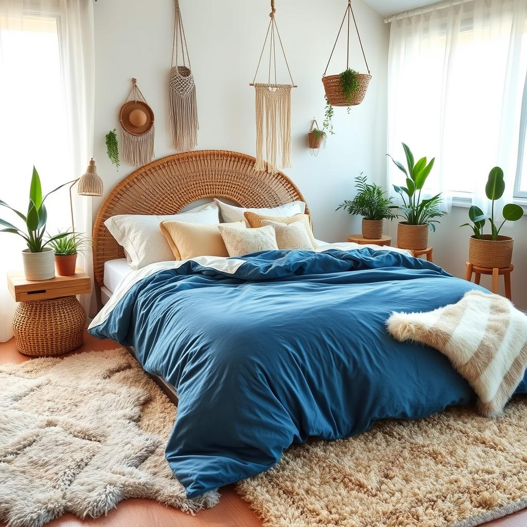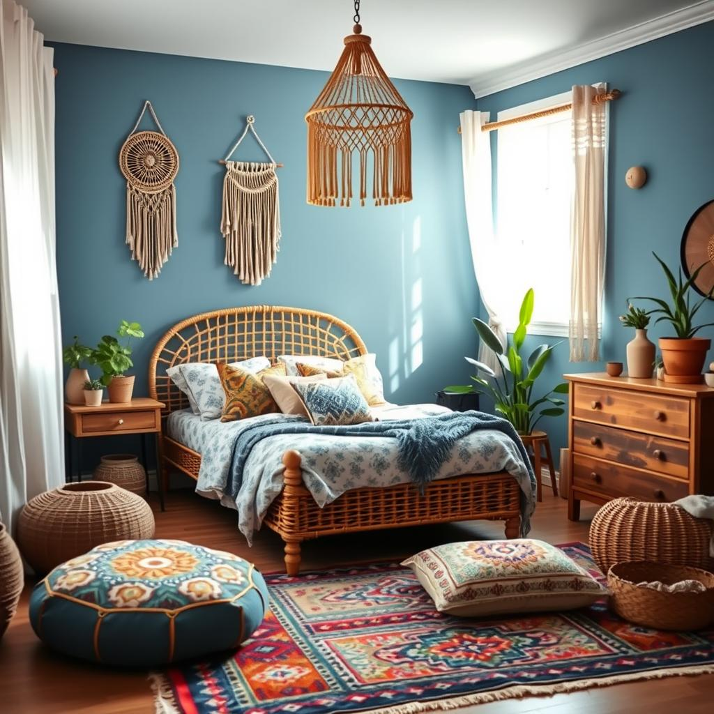 A cozy boho bedroom featuring an eclectic mix of blue and earthy tones, showcasing a vintage wicker bed frame adorned with soft, patterned bedding. Incorporate a low wooden dresser with decorative plants and small artifacts. Add a colorful area rug, hanging macrame wall art, and floor cushions for a relaxed atmosphere. Include natural light streaming through sheer curtains, creating a serene oasis vibe.