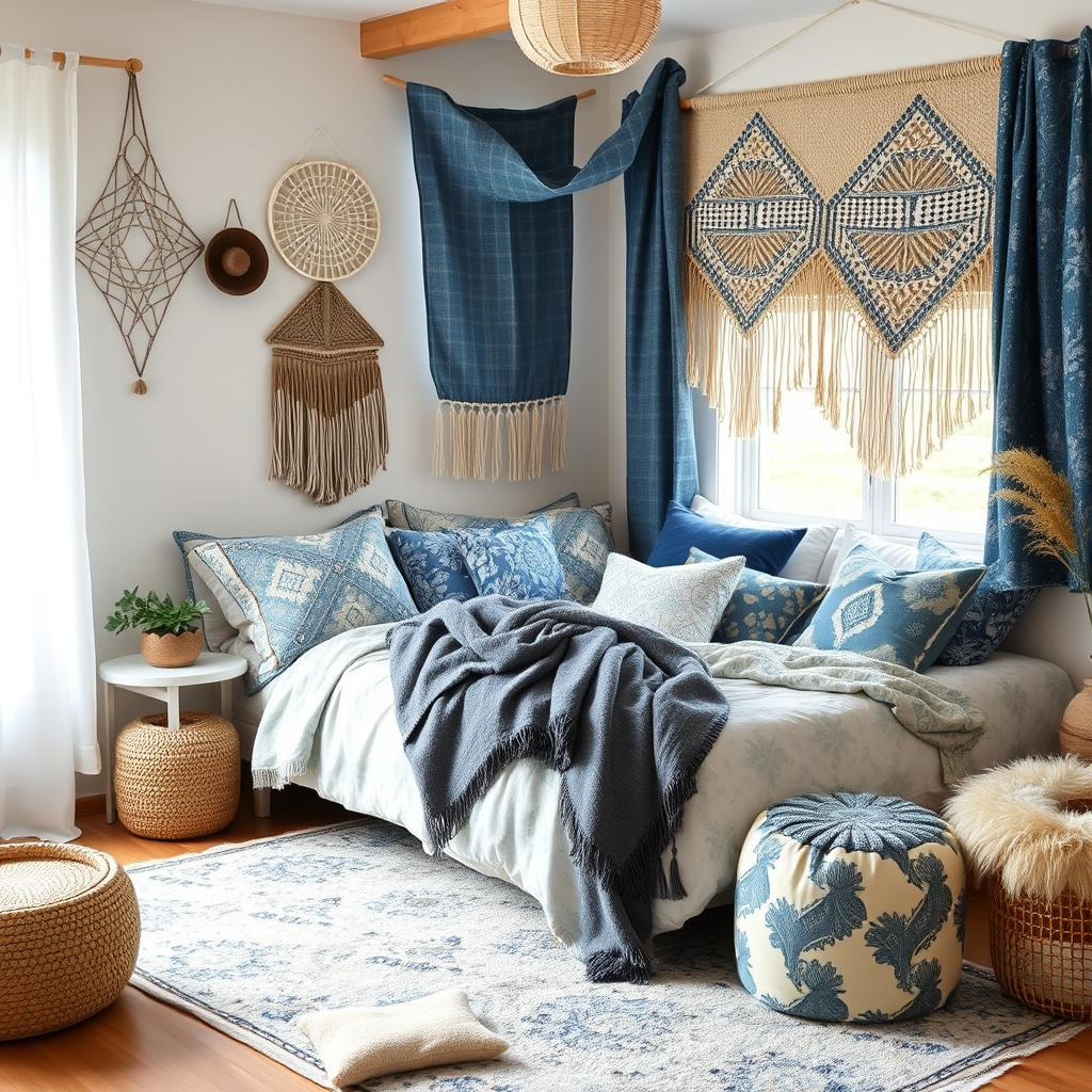 A cozy boho bedroom scene featuring various textiles and fabrics in shades of blue, including patterned throws, woven wall hangings, fluffy cushions, and a soft area rug. Showcase an eclectic mix of geometric prints and floral designs, layered together to create a serene and inviting atmosphere, with soft natural light filtering through a window.
