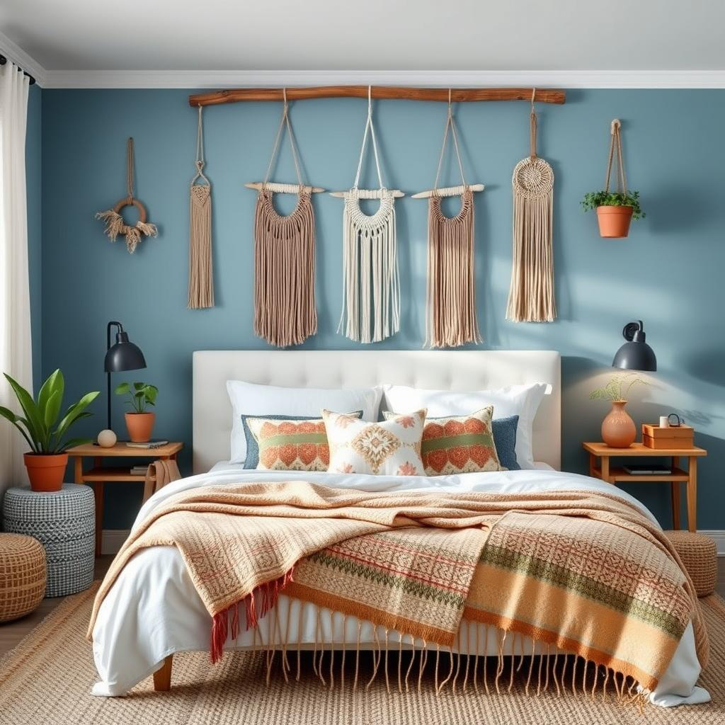 Boho bedroom design featuring a soothing blue color palette, eclectic textiles, patterned throw pillows, a cozy bed with a woven blanket, natural wood accents, macramé wall hangings, plants in terracotta pots, soft lighting from bedside lamps, and a serene atmosphere.