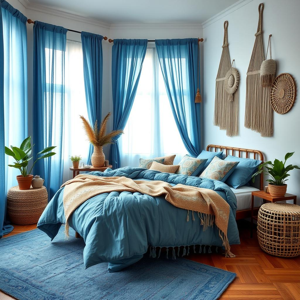 A serene boho bedroom featuring various shades of blue, adorned with textured fabrics and eclectic patterns. Incorporate a cozy bed with a layered blue quilt, decorative pillows, and woven throw blankets. Include bohemian elements such as macramé wall hangings, indoor plants in terracotta pots, and rattan furniture. Soft natural light filtering through sheer blue curtains, creating a tranquil ambiance, complemented by a blue area rug on warm wooden floors.