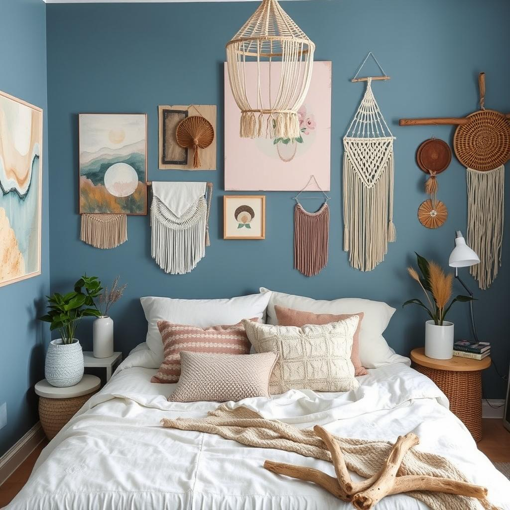 Bohemian bedroom featuring a serene blue color palette, displaying a variety of wall art pieces including abstract paintings, macramé hangings, and woven textiles, adorned with natural elements like plants and driftwood, creating a cozy and artistic atmosphere.
