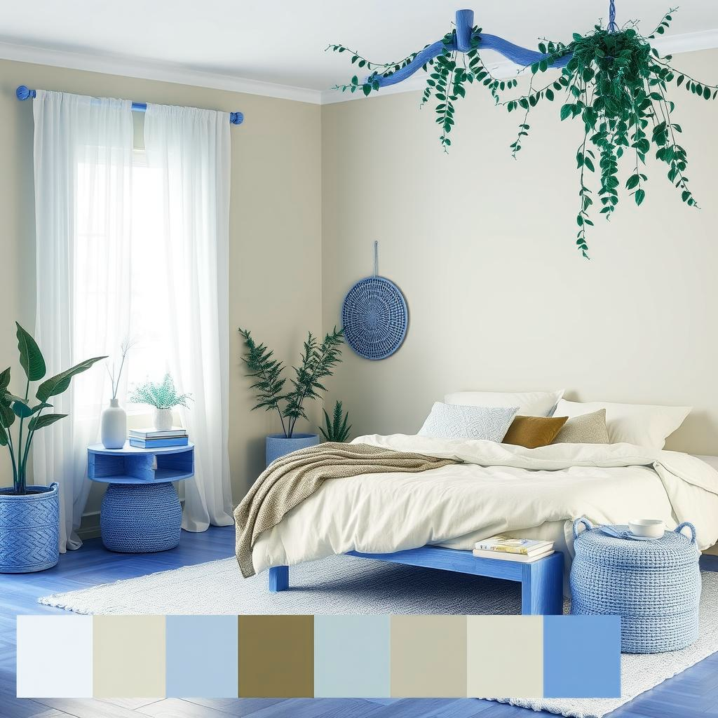 Serene color palette inspired by a boho bedroom, featuring soft blue hues, gentle pastel tones, textured fabrics, natural wood accents, and lush greenery, creating a tranquil and inviting atmosphere.