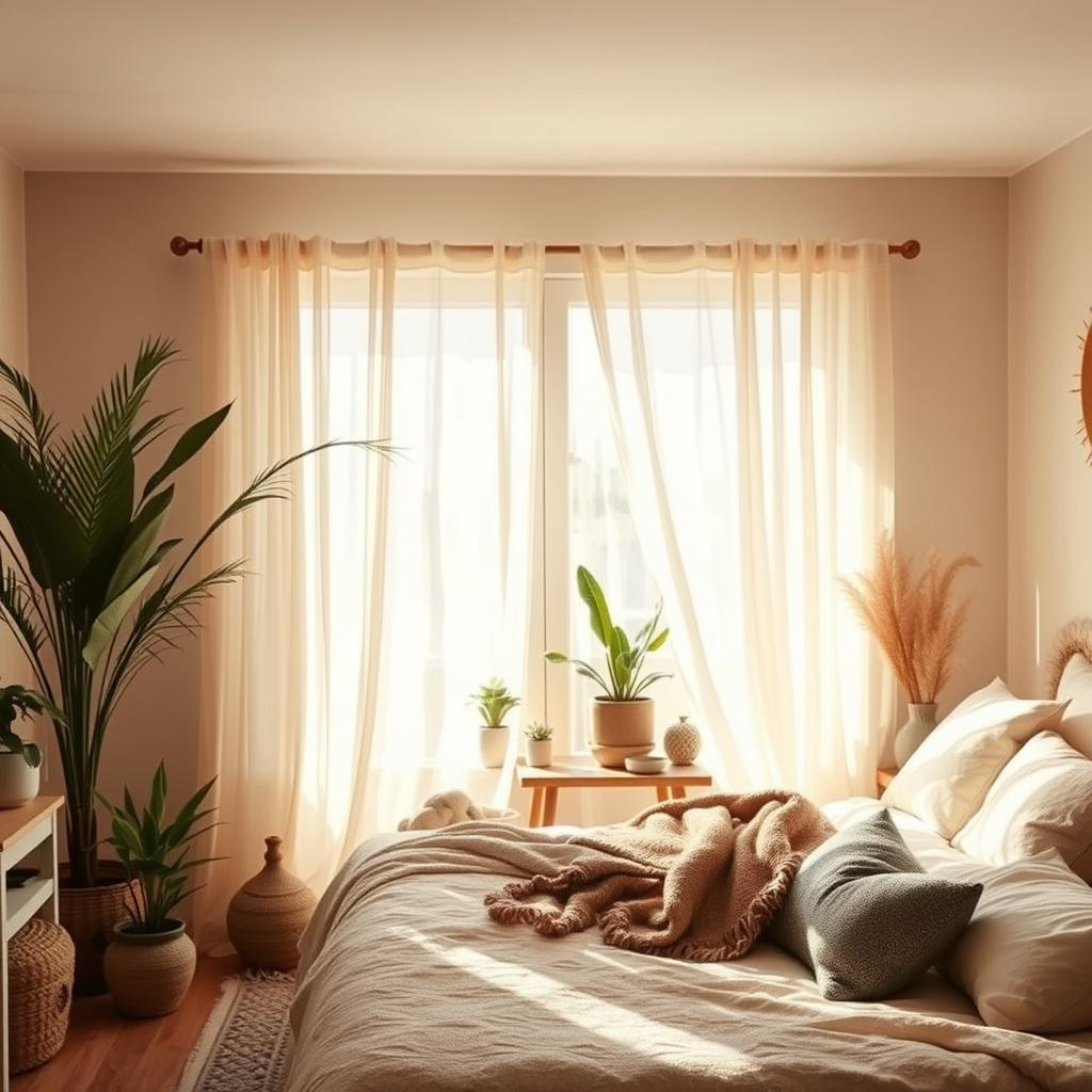 A cozy boho bedroom bathed in soft, natural light, featuring airy sheer curtains gently swaying, warm earthy tones, textured textiles, potted plants, and minimalist decor that create a serene oasis ambiance.