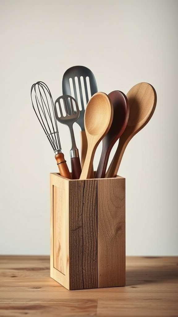 Wooden utensil holders are simple DIY scrap wood projects that can add a personal touch to your kitchen. You can make one by cutting pieces of scrap wood into your desired size and then assembling them with wood glue or nails. For a fun twist, try adding paint or wood stain to match your kitchen decor!